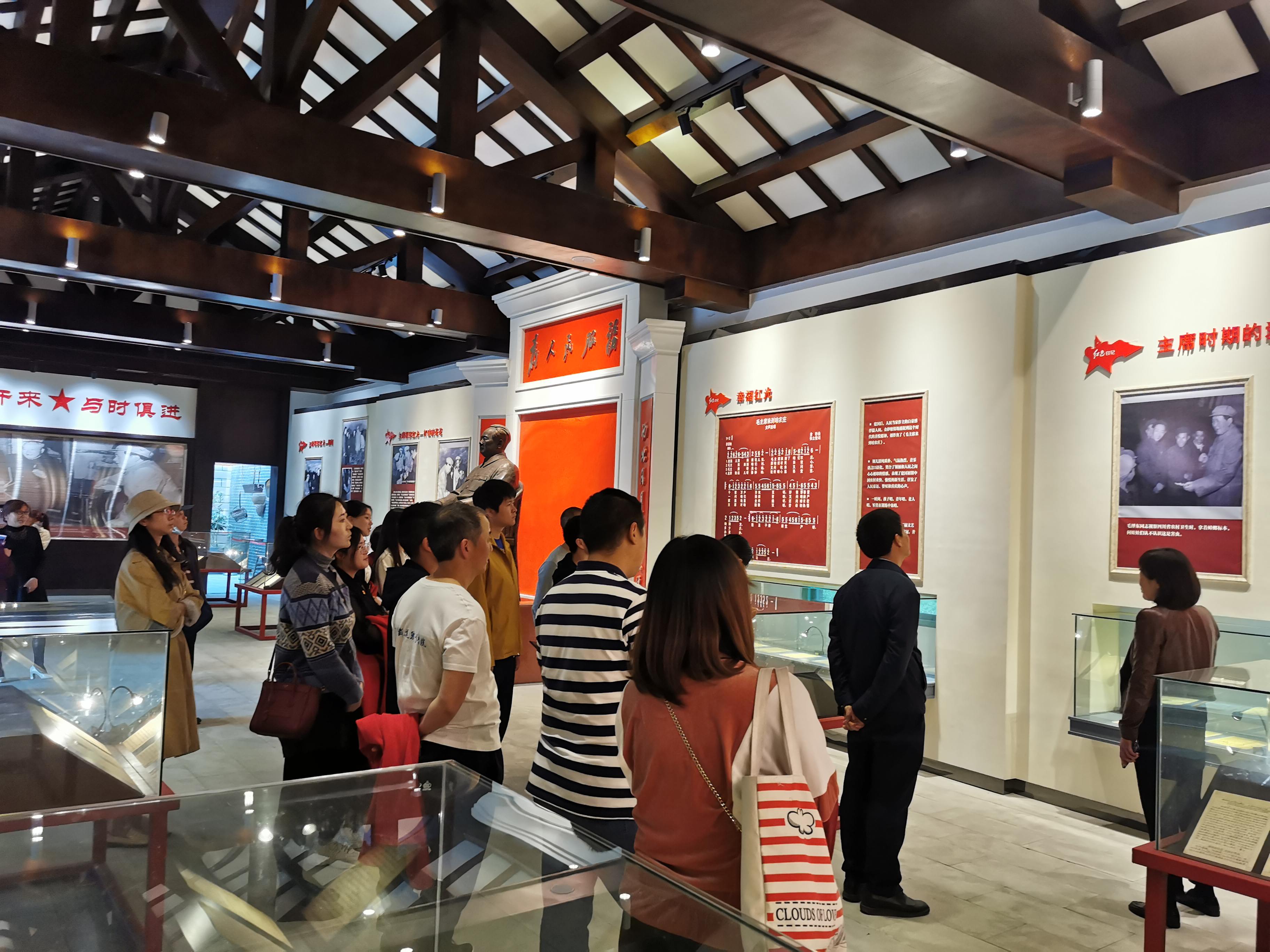 本次活动主要分为参观学习、重温入党誓词、向毛主席雕像鞠躬致敬三个部分。讲解员首先带领我系全体党员及学生发展对象参观了“幸福亭”,1958年3月16日,毛主席到郫县合兴乡红光农业合作社视察,为纪念毛主席视察红光高级农业合作社这一事件,合作社社员们于1960年修建了幸福亭,据悉,该亭取名“幸福亭”,寓意毛主席领导工农大众翻身得解放,又带领中国人民走上社会主义的幸福康庄大道。参观完毕“幸福亭”,同志们进入展览室内进行参观,并认真聆听了讲解员的解说,学习了毛主席视察红光社的历史经过及毛主席时期的爱国卫生运动,参观了毛主席诗作如《送瘟神》、《沁园春·雪》及其他文史资料。随后,城轨车辆系党总支书记龙明贵同志带领全系党员同志们在纪念馆大厅面向党旗重温了入党誓词,并集体面向毛主席铜像鞠躬致敬,以此深切缅怀毛泽东同志等代表的老一辈无产阶级革命家的丰功伟绩。