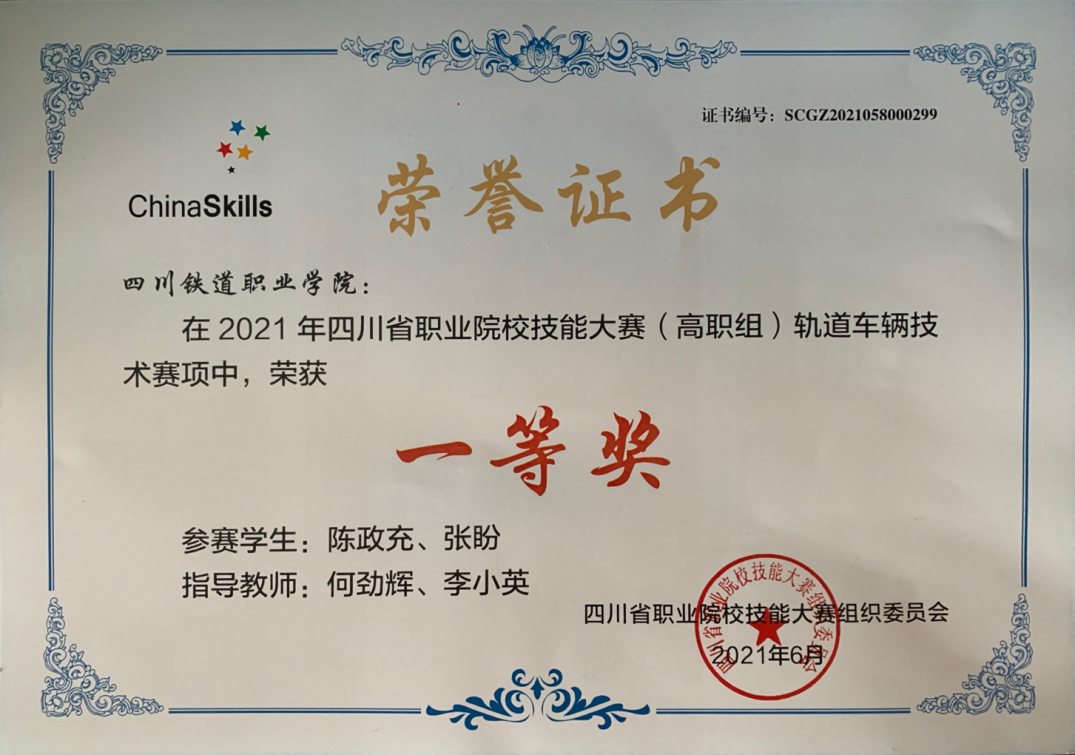 2021年9月3日,8797威尼斯老品牌收到了四川省教育厅颁发的“2021年四川省职业院校技能大赛(高职组)轨道车辆技术”赛项的荣誉证书。