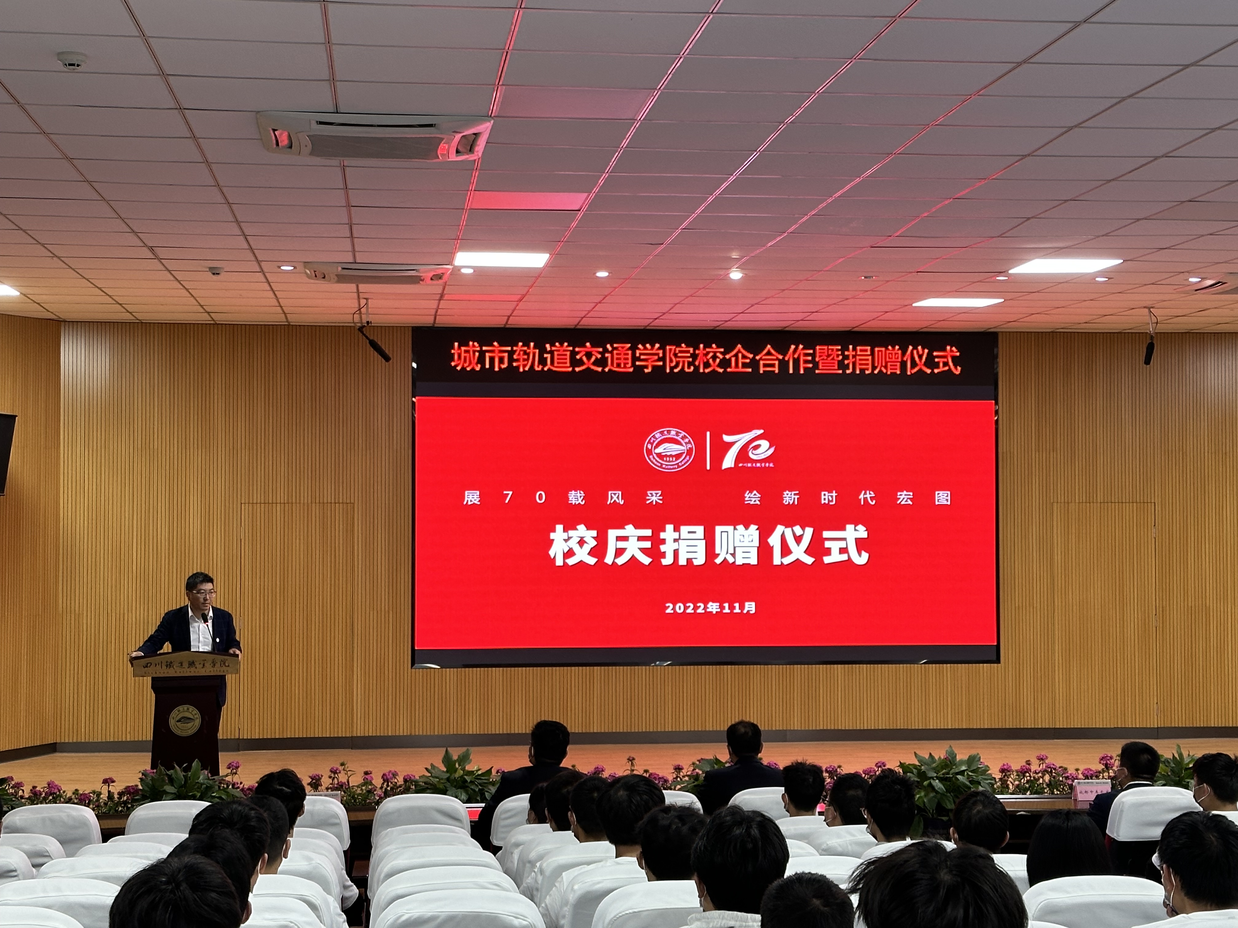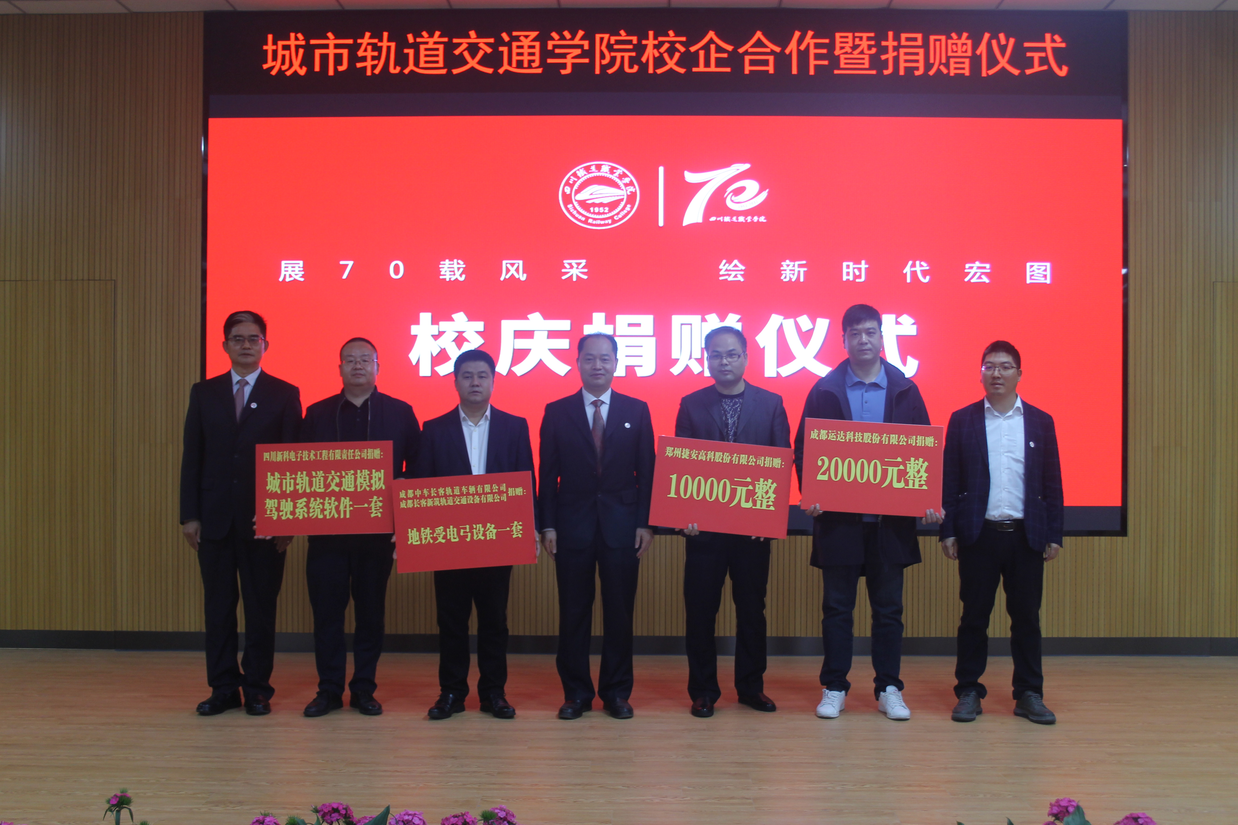11月12日,在庆祝建校70周年之际,城市轨道交通学院在学术报告厅举行校企合作暨捐赠仪式,来自成都中车长客轨道车辆有限公司、成都长客新筑轨道交通装备有限公司、成都运达科技股份有限公司、郑州捷安高科股份有限公司、四川新科电子技术工程有限责任公司5家企业代表共聚一堂,联袂捐赠,助力学校建设发展。捐赠仪式由城市轨道交通学院院长杨凤主持,捐赠企业嘉宾、学校党委副书记刘昊君、学院党总支书记王文杰、学院教师及100余名学生代表出席会议。