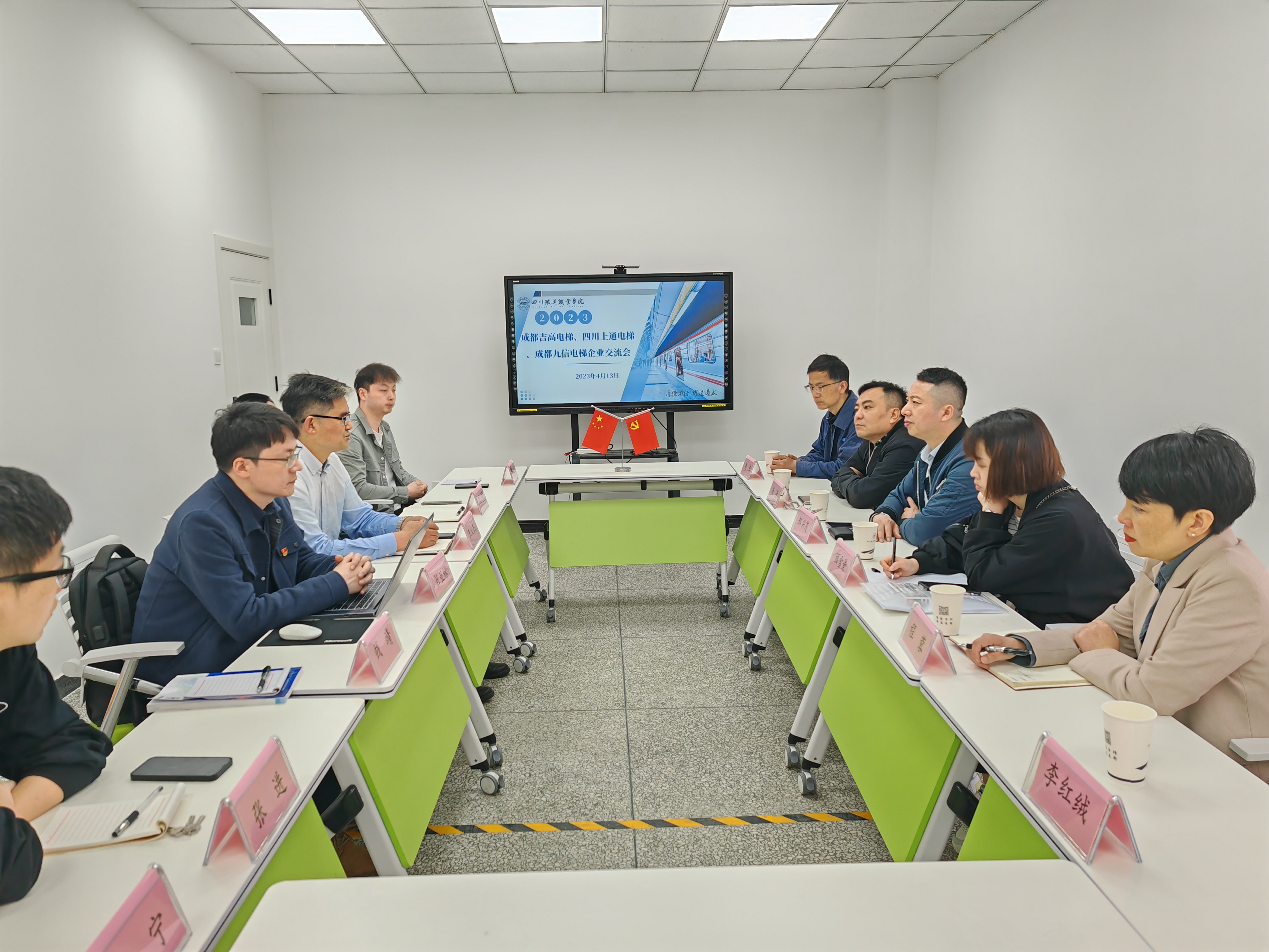 宣讲结束后,校企双方在城市轨道交通学院会议室展开座谈交流。会上,王文杰同志向三家企业的到来表示欢迎,并介绍了学校、学院基本情况,提出学生实习、就业及专业发展等方面的合作设想。成都吉高电梯工程有限公司邹兴茂总经理代表三家企业介绍了电梯行业的发展前景、人才需求,表达了在学生实习、就业及多方面深度校企合作的意愿。校企双方共同探讨了师资培养、人才培养、实训室建设、资源建设等方面的合作细节,并讨论组建订单班的可行性。