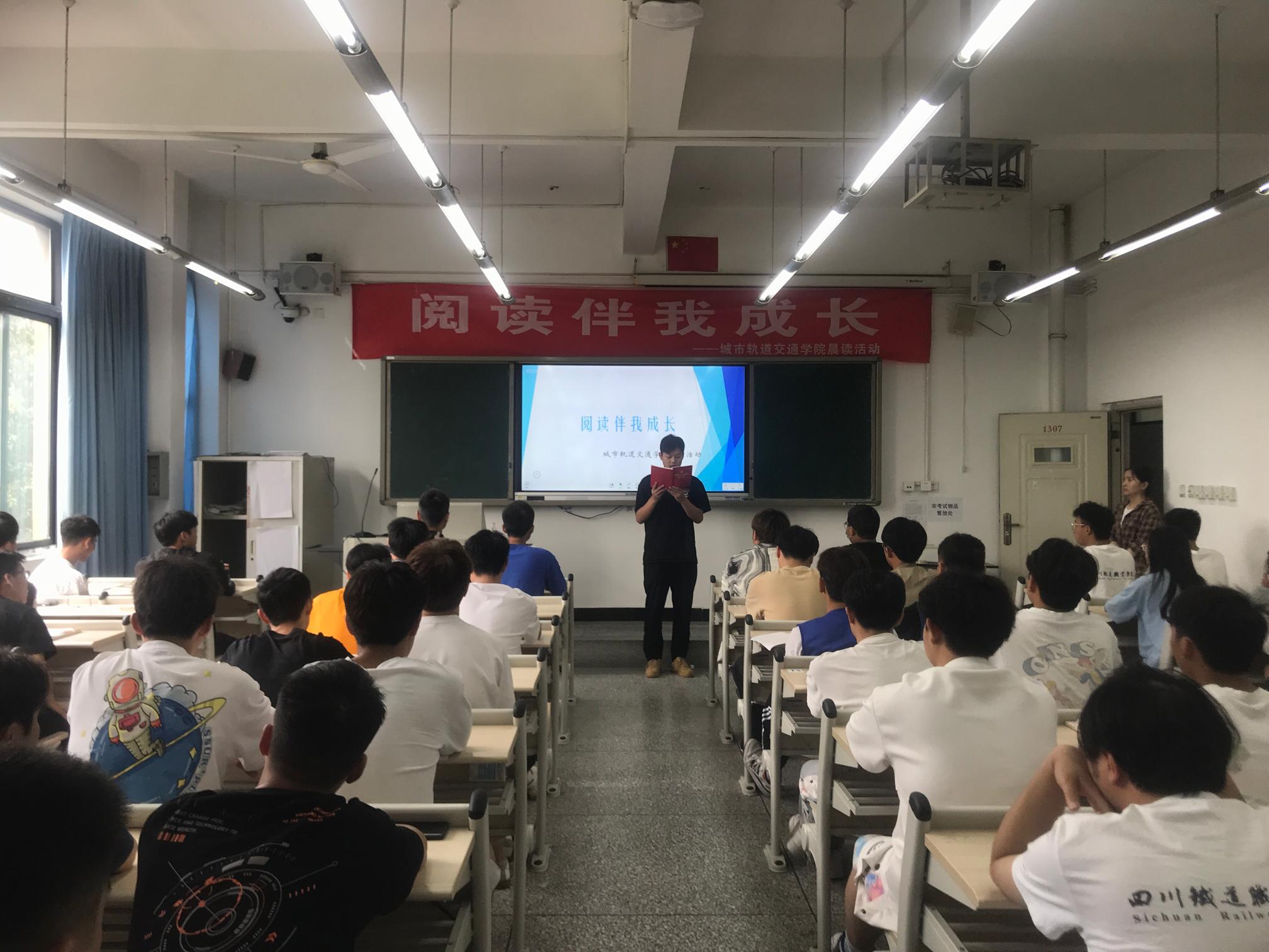 城市轨道交通学院自2023年5月15日起组织各班开展“阅读伴我成长”晨读活动。 活动中,辅导员组织各班入党积极分子领读党的二十大报告。通过读原文、悟原理、话心声,引领同学们用声音传递力量,用诵读致敬新时代。学院充分发挥主阵地作用,把学习党的二十大精神融入晨读活动中,同学们通过学思想、悟原理,将思想和行动统一到党的二十大部署的任务要求上来,在党的二十大精神的指引下,立志做有理想、敢担当、能吃苦、肯奋斗的新时代好青年,踔厉奋发、勇毅前行,让青春在社会主义文艺繁荣发展的伟大实践中绽放绚丽之花。