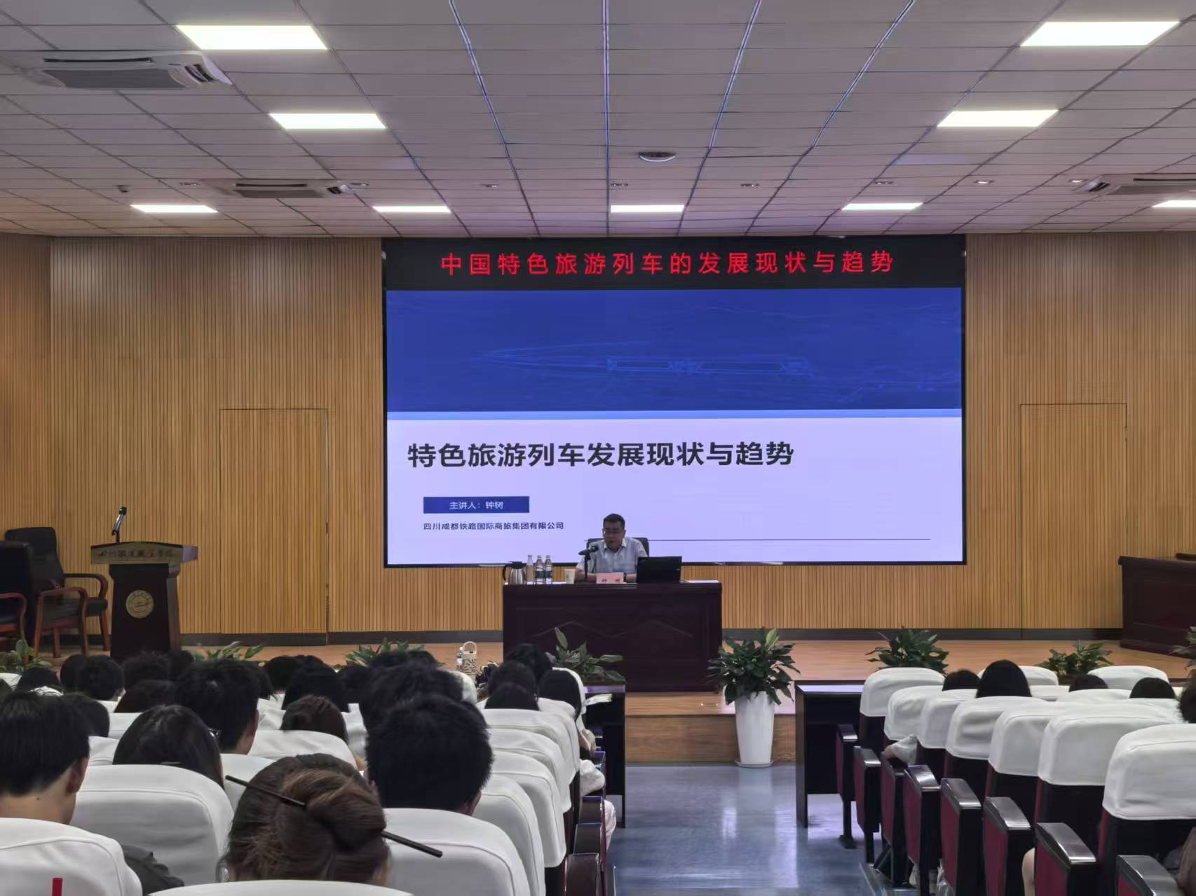为深化产教融合,积极推进铁旅融合发展新路径,6月13日下午,四川成都铁路国际商旅集团有限公司旅游管理部部长钟树受邀走进校园,以“旅游列车发展现状与趋势”为主题,为经济管理学院师生带来了一场专业讲座。作为学院精心策划的“中国铁路系列讲座”第一课,此次活动吸引了200余名师生到场,学习氛围热烈。