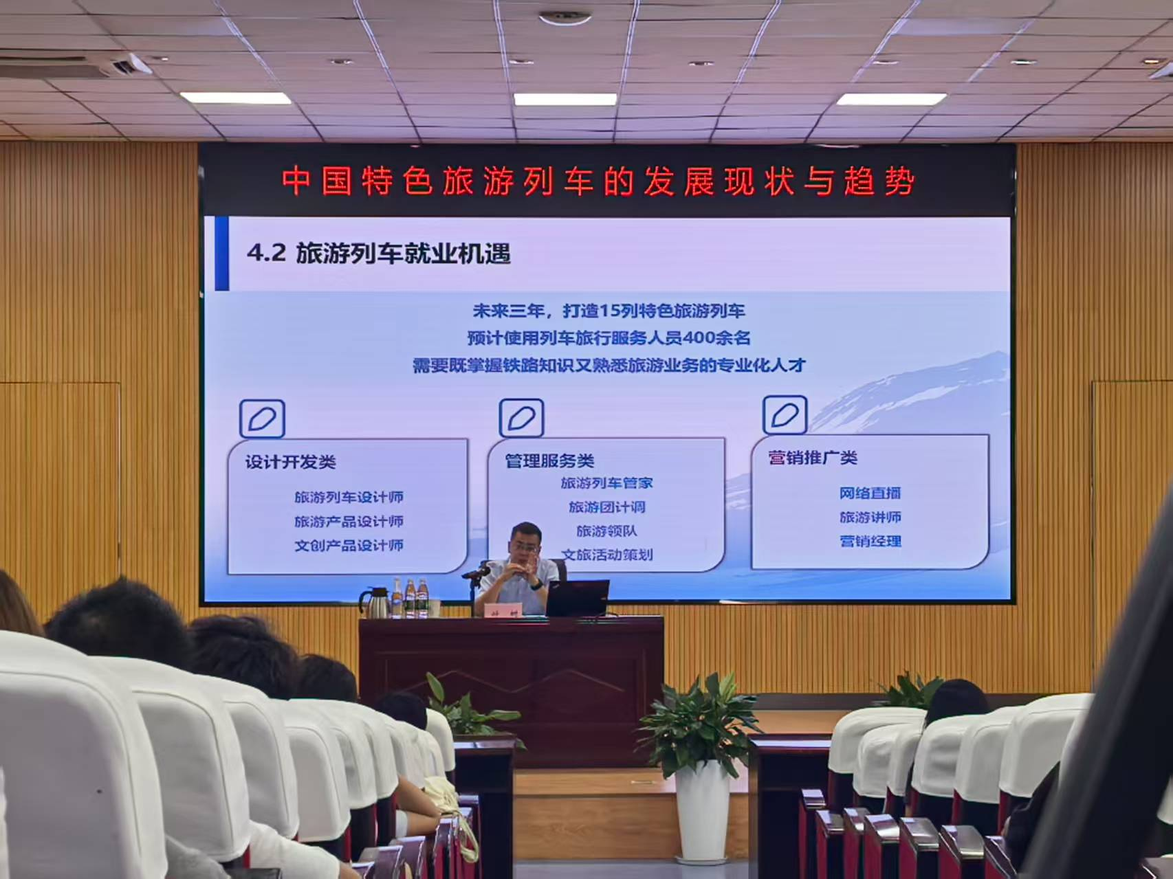 钟树围绕旅游列车创新发展的时代机遇、铁路特色旅游列车的发展现状、特色旅游列车发展的未来展望、铁路旅游岗位需求和就业机遇四大核心板块,结合丰富的行业经验与案例,为同学们展开了全面而深入的分享。他着重介绍了中国铁路成都局匠心打造的“什邡号”“安逸号”“岷江号”及“成都号”特色旅游列车,从列车别具一格的设计理念、充满地域文化特色的服务内容,到其显著的经济效益与市场反响进行了细致入微地讲解。他还介绍了国铁集团未来三年在铁路旅游领域的战略规划,描绘了铁旅融合发展的宏伟蓝图。 钟树还结合学院往届毕业生在“成都号”“什邡号”的实习就业案例,生动展现了铁路旅游行业广阔的发展前景。他激励在场同学要充分利用在校时光,扎实学习专业知识,积极提升职业技能与综合素质,主动拥抱铁旅融合的时代浪潮,实现个人价值与行业发展的双赢。