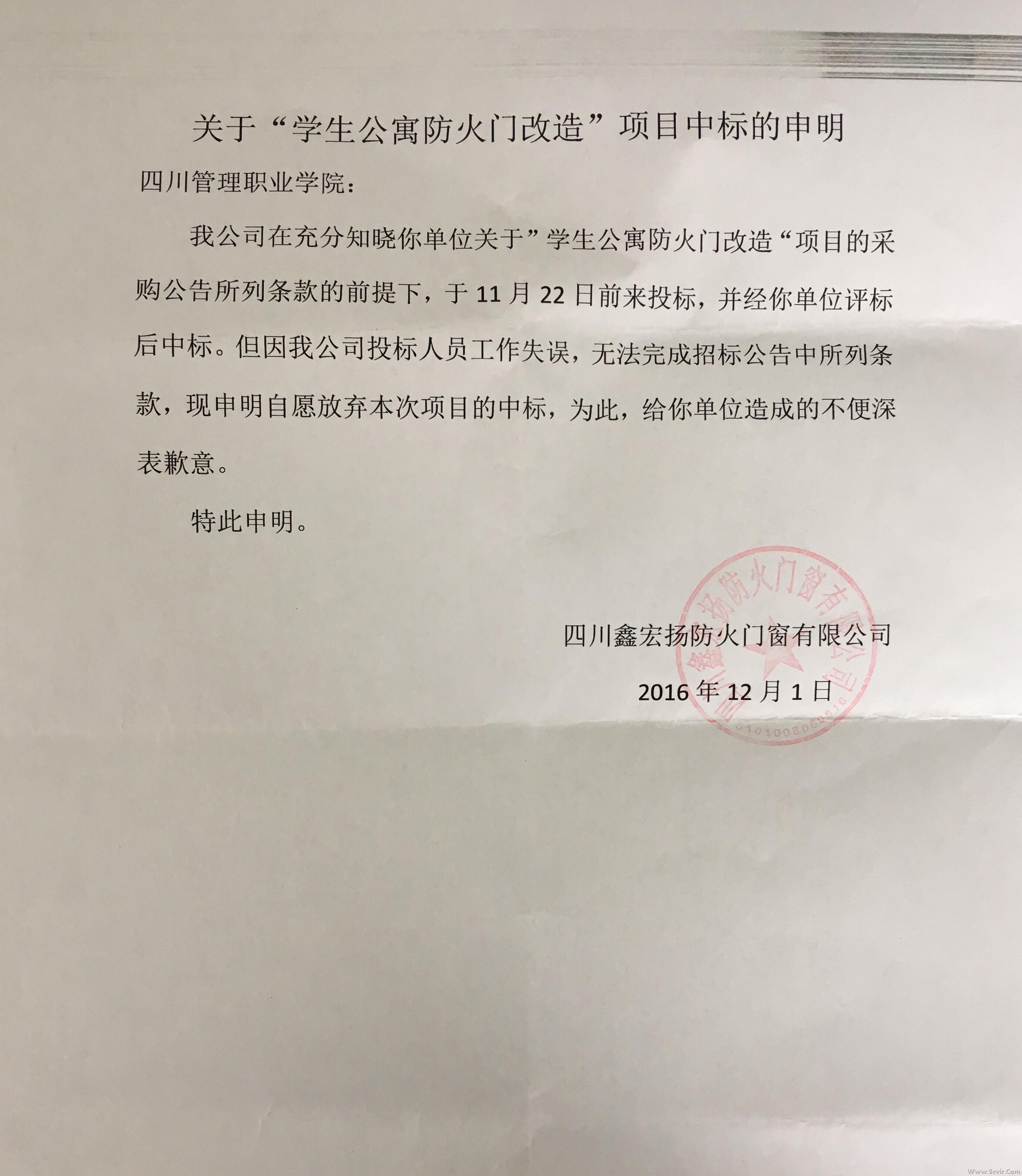 2016年11月16日,我院在学院内网及外网上发布了“学生公寓防火门改造”项目的采购公告,于11月22日下午2点在学院后勤处办公楼201室进行了开标。经院内评标委员会按照公告中明确的评审办法,对四家投标单位进行评选,确定:四川鑫宏扬防火门窗有限公司为第一名中标候选人,并将相关评选结果在学院内网及外网上进行了公示。公示期届满,最终确定四川鑫宏扬防火门窗有限公司为中标单位。但该单位在签订合同时,告之无法按照采购公告中所列条款完成采购项目,申明自愿放弃该项目(见附件)。根据《中华人民共和国政府采购法实施条例》的相关规定,现依顺序确定第二名中标候选人:成都铁牛门业有限公司为本次项目的中标人。 特此公告。