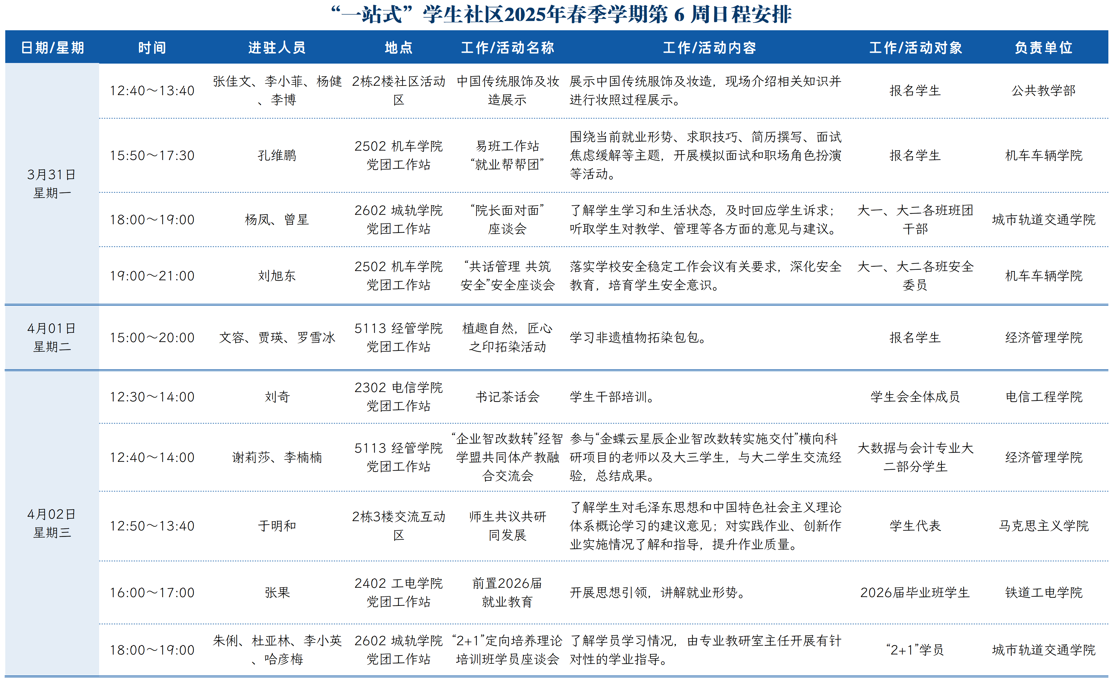 “一站式”学生社区2025年春季学期第6周日程安排
