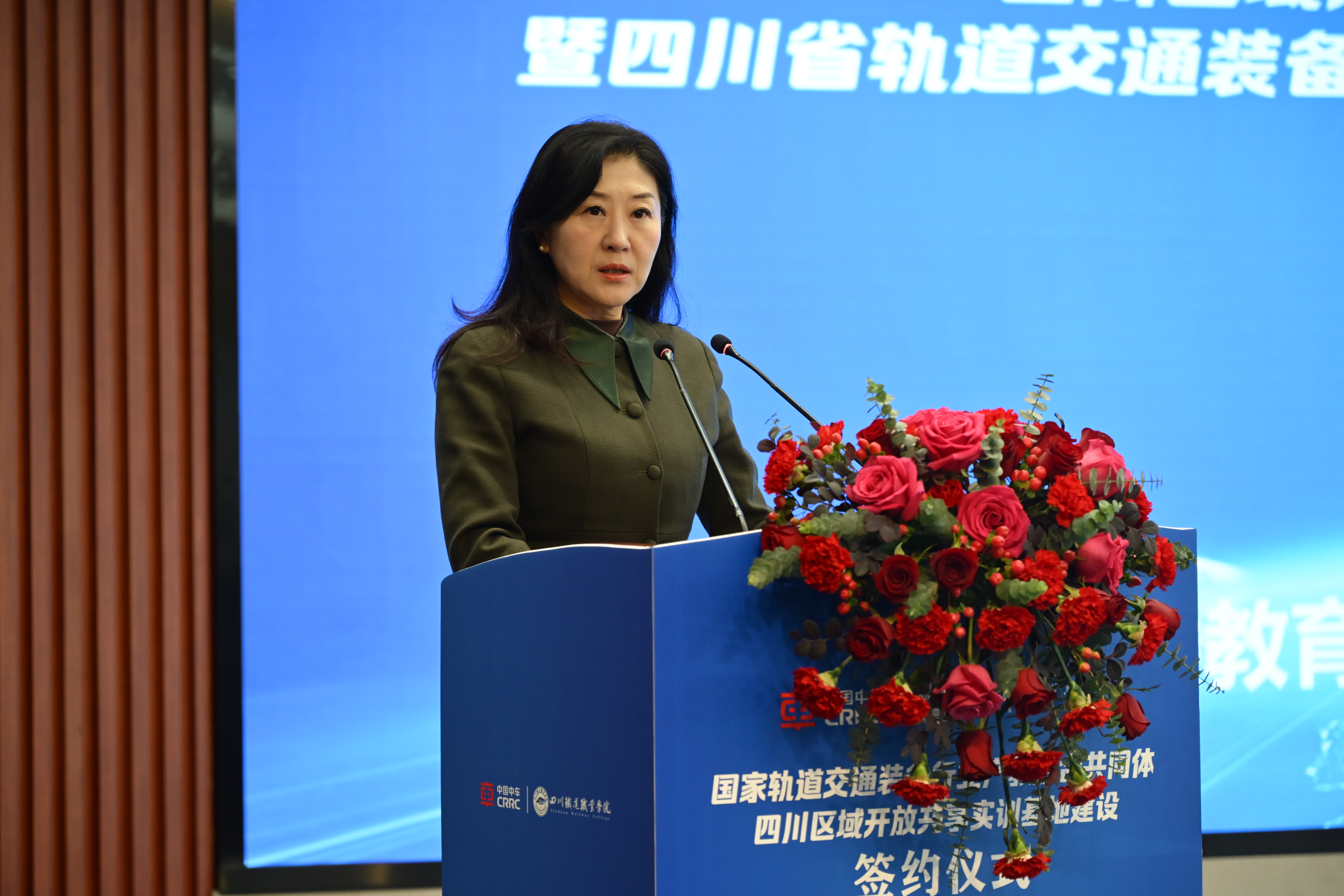 中国中车集团有限公司党委委员、工会主席赵虎讲话 赵虎在讲话中指出,国家轨道交通装备行业产教融合共同体是首个国家级行业产教融合共同体,是教育部和中国中车集团共同贯彻落实党中央、国务院关于深化现代职业教育体系改革的重要举措。四川区域开放共享实训基地的签约,对于深化校企合作、促进教育链、人才链与产业链、创新链的有机衔接,具有里程碑重要的意义。希望共享基地的各成员单位同心同向,共创共赢,将实训基地打造为赓续红色基因、传承红色文化的 “示范校”;轨道交通装备行业原创技术的 “策源地”;轨道交通装备行业科技人才的 “孵化园”;推进形成新质生产力的 “动车头”。为轨道交通装备行业的转型升级提供更坚实的人才保障和智力支持。
