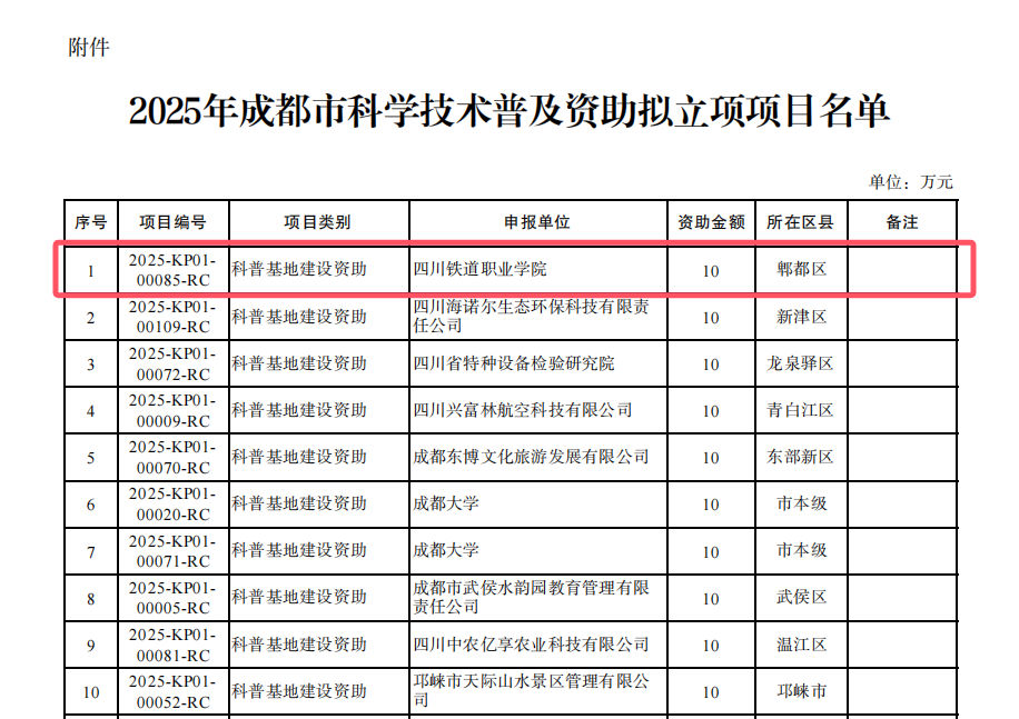 近日,成都市科学技术局公布《2025年成都市科学技术普及资助拟立项项目名单》,由威尼斯申报的“牵引未来 运载梦想”轨道交通实践体验科普基地成功入选“成都市科普基地”,并获10万元立项资金支持。这是威尼斯首次获批市级科普基地,标志着学校在整合学科资源、服务社会科普方面取得重要突破。