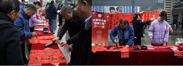 尤为值得一提的是,成都市文学艺术界联合会的艺术家们通过书写春联的方式,为活动增添了浓厚的文化气息。志愿者与旅客共同挥毫泼墨,写下对新年的美好祝愿。一幅幅春联,不仅传递着对新春的喜悦与祝福,更拉近了志愿者与旅客之间的距离,让整个西广场洋溢着温馨与和谐。这一环节,不仅让旅客在旅途中感受到了家的温暖,更让他们深刻体会到了中华传统文化的独特魅力。