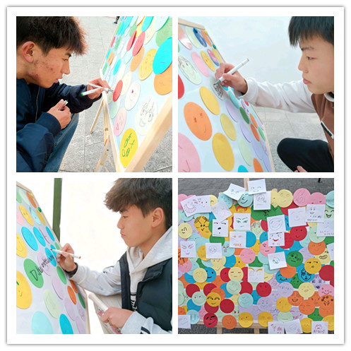 此外,“投走烦恼”、“共绘笑脸墙”等活动也同步开展。同学们将烦恼写在便签投入解忧箱,手持羽箭精准投掷,在趣味竞技中宣泄情绪;在笑脸墙前,大家用画笔勾勒喜悦,让一张张笑脸汇聚成传递善意的温暖地标。