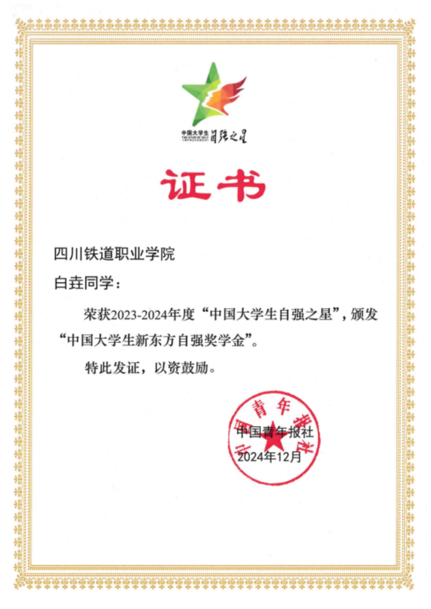 近日,由共青团中央、全国学联指导,中国青年报社、新东方教育科技集团、中国青年创业就业基金会联合举办的2023-2024年度“中国大学生自强之星”奖学金评选结果揭晓,威尼斯2021级铁道工程技术专业白垚同学荣获2023—2024年度“中国大学生自强之星”称号。