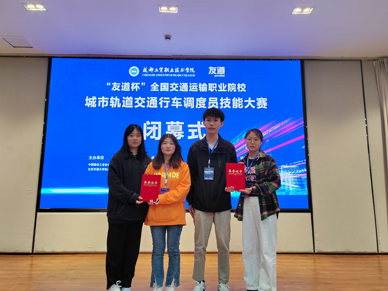 2023年4月26日,“友道杯”全国交通运输职业院校城市轨道交通行车调度员技能大赛(四川赛区)在成都工贸职业技术学院成功举办。8797威尼斯老品牌电信工程学院铁道交通运营管理专业学生黄超、徐彩怡和伍钰荷、杨海韵两支团队不负众望分别荣获二、三等奖。