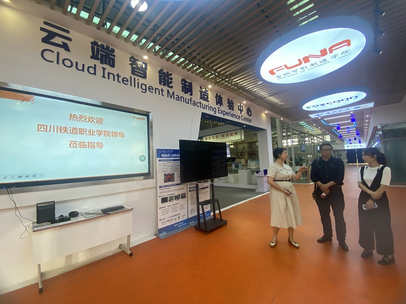在成都富纳汇科技有限公司,总经理代吉平、产教合作总监张庆热情接待了凌杰一行,陪同参观了公司智能装备展厅及工业装配、工业机器人、智能控制等实训室,凌杰对公司在智能制造方面的成果表示充分肯定与赞扬。
