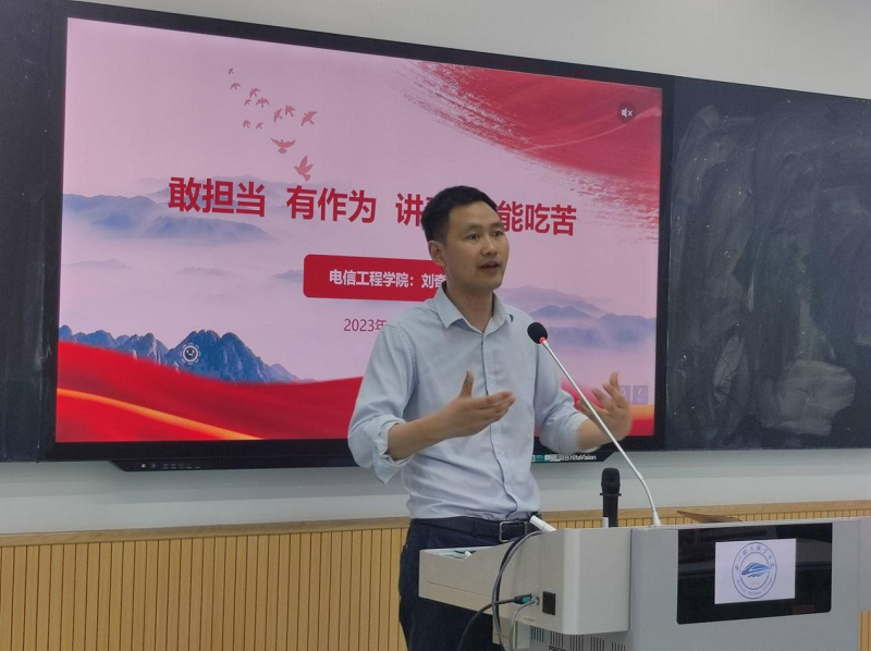 5月31日,电信工程学院党总支副书记刘奇以《敢担当 有作为 讲奉献 能吃苦》为题,在2302教室为电信工程学院党员教师、发展对象、积极分子等40余人讲了一堂专题党课。