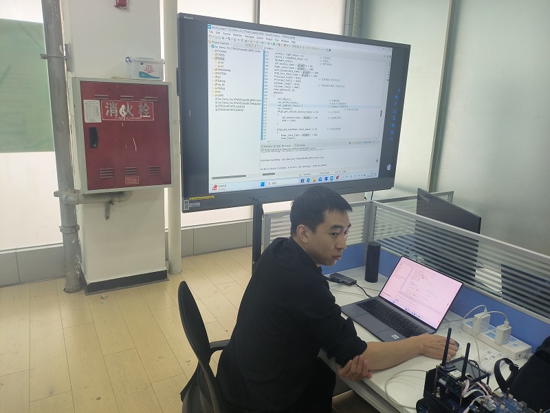廖旭操与智能专业教师和学生进行了互动交流,指导他们如何进行项目设计、开发和测试,提出了项目改进建议。他还现场演示了一些智能产品的制作过程和效果,如智能小车、智能手环、智能门锁等,引起了大家的浓厚兴趣和热烈反响。