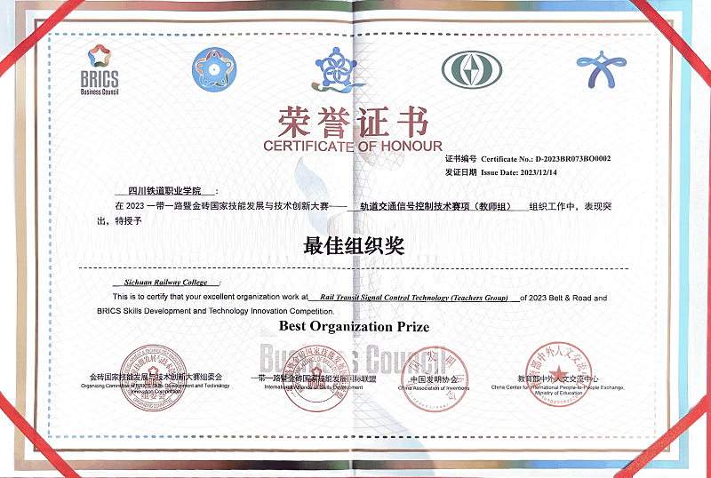 2023年12月14日,2023年第七届“一带一路”暨金砖国家技能发展与技术创新大赛轨道交通信号控制技术赛项全国总决赛在重庆闭幕。经过激烈角逐,威尼斯电信工程学院专任教师陈龙、周莹获得教师组一等奖;信号19A1班周盈佑、信号21T3班牛文晖获得学生组二等奖;学校荣获最佳组织奖,指导教师荣获优秀指导教师奖。