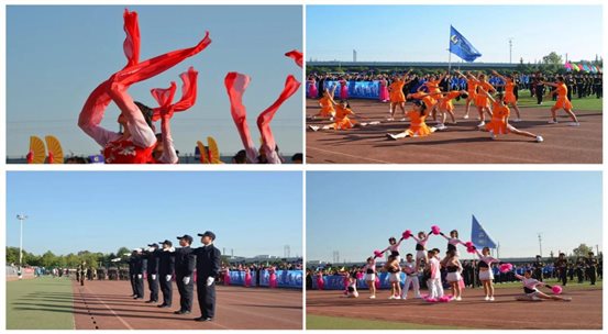 图1 国旗护卫队、彩旗队、鲜花队、青年志愿者方队入场  图2 教工队和各系部入场  图3 各系部文艺表演