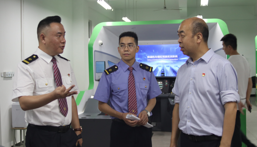 报告团一行在杨海涛、罗林顺等人的讲解下分别参观了HXD3C机车模拟驾驶装置以及CR200J、CR400AF/BF动车组模拟驾驶装置,就地考察了铁道机车运用与维护专业列车牵引控制系统综合应用、动车组驾驶及故障判断处理备赛和培训相关场地和设备,充分感受学校办学条件和办学实力。