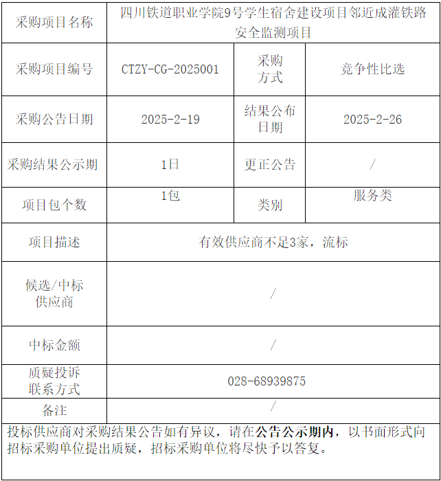 9号学生宿舍建设项目邻近成灌铁路安全监测项目结果公告