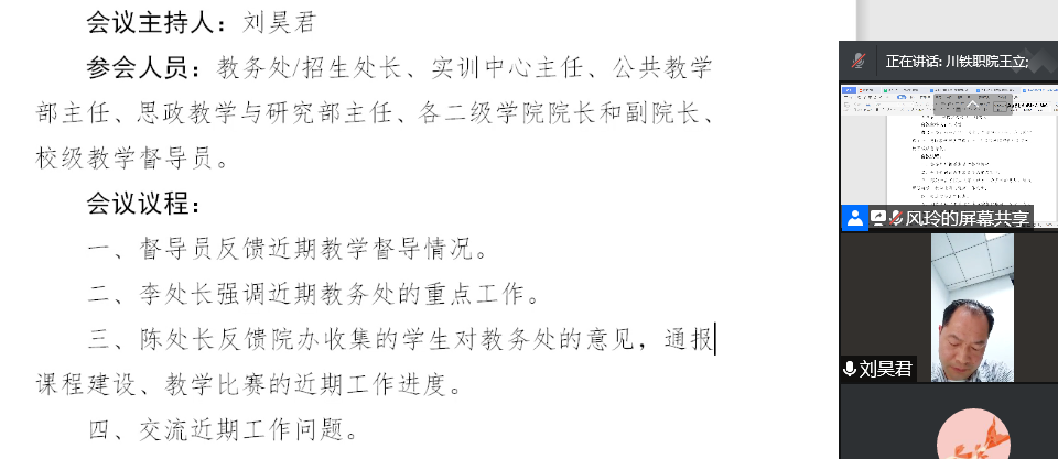 4月12日晚,本学期第三次教学例会通过腾讯会议在线上进行。会议由校党委委员、副校长刘昊君主持。教务处处长、实训中心主任、公共教学部主任、思政教学与研究部主任、各二级学院院长和副院长、校级教学督导员参加会议。