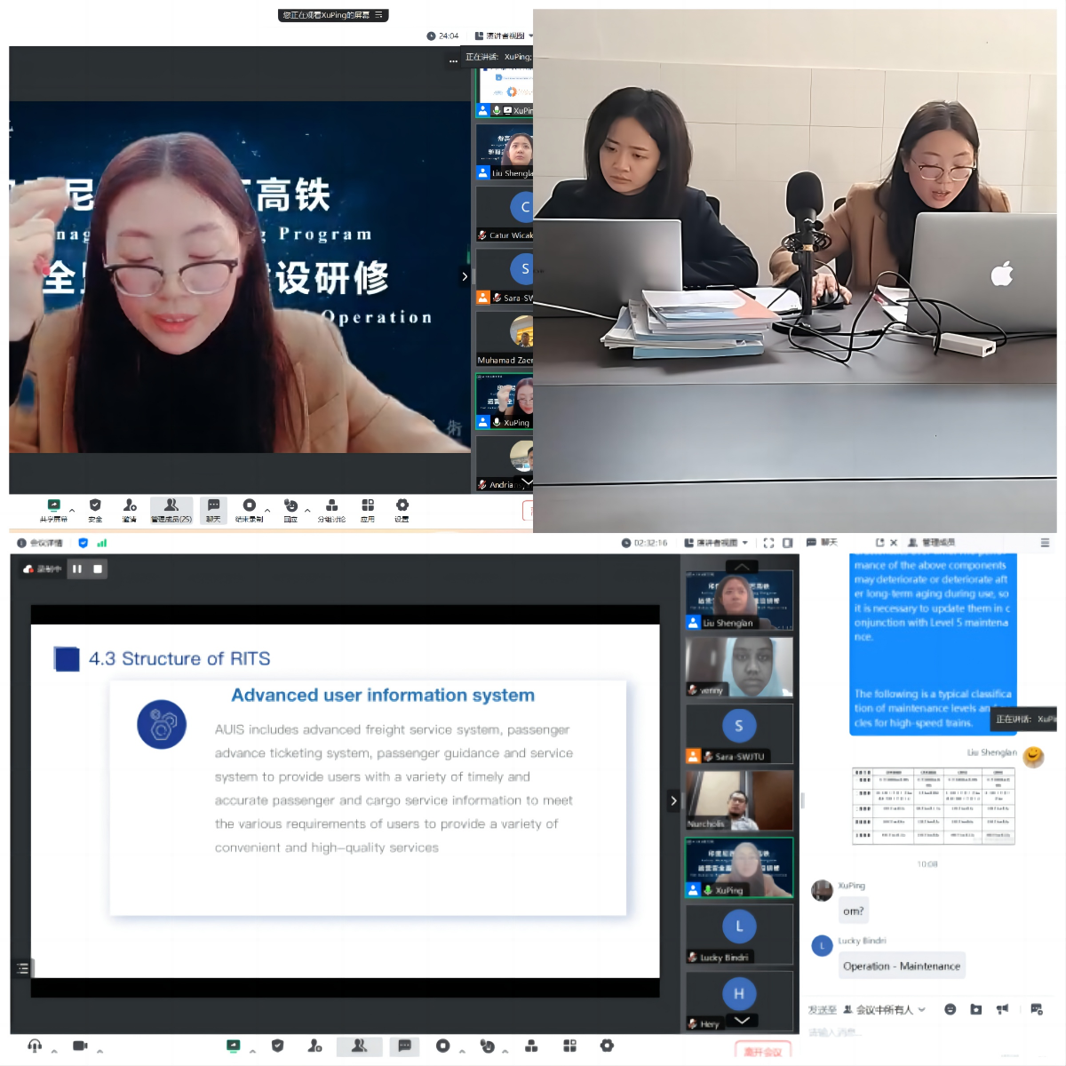 12月7日上午,威尼斯教师刘盛蓝、徐萍受邀为西南交大主办的印度尼西亚雅万高铁运营安全监督能力建设研修班讲授《高铁运营安全管理》课程。此次研修班主要针对印度尼西亚交通部铁路局、铁路局安全处、印度尼西亚铁路理工学院的官员开展,旨在提升印尼雅万高铁运营安全及管理效率,加强中印尼两国在高速铁路领域的交流与合作。