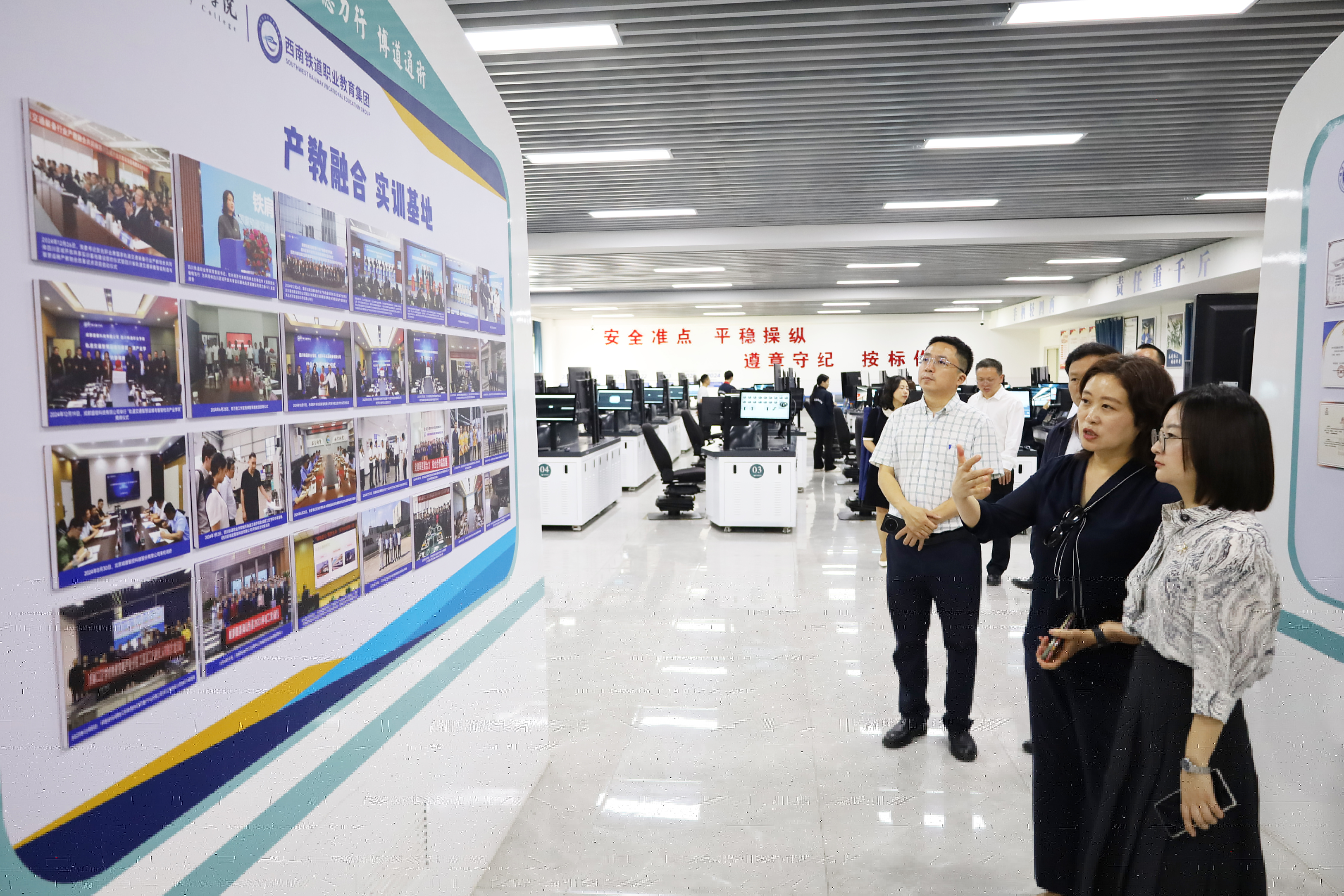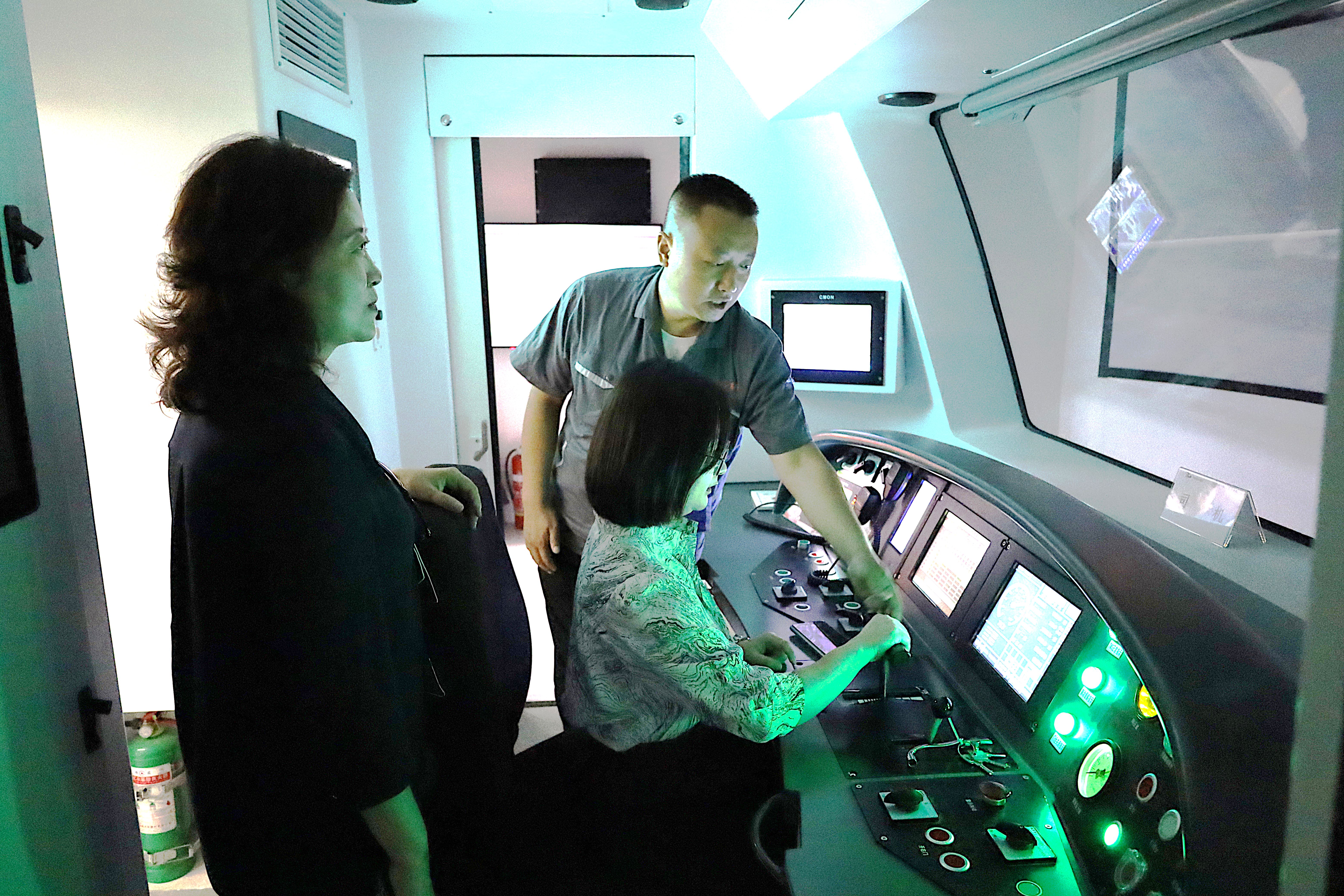 杨丹一行实地考察了威尼斯特色教学实训场所,在铁道精神博物馆暨校史馆,杨丹通过珍贵的历史资料和实物展品,深入了解了学校发展历程和铁路文化传承;在“四电集成”实训基地,她仔细观摩了铁道工程技术、铁道供电技术等专业实训教学;在动车组模拟驾驶考培基地,杨丹亲自体验了模拟驾驶系统。