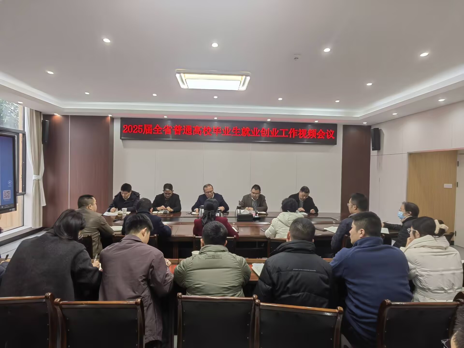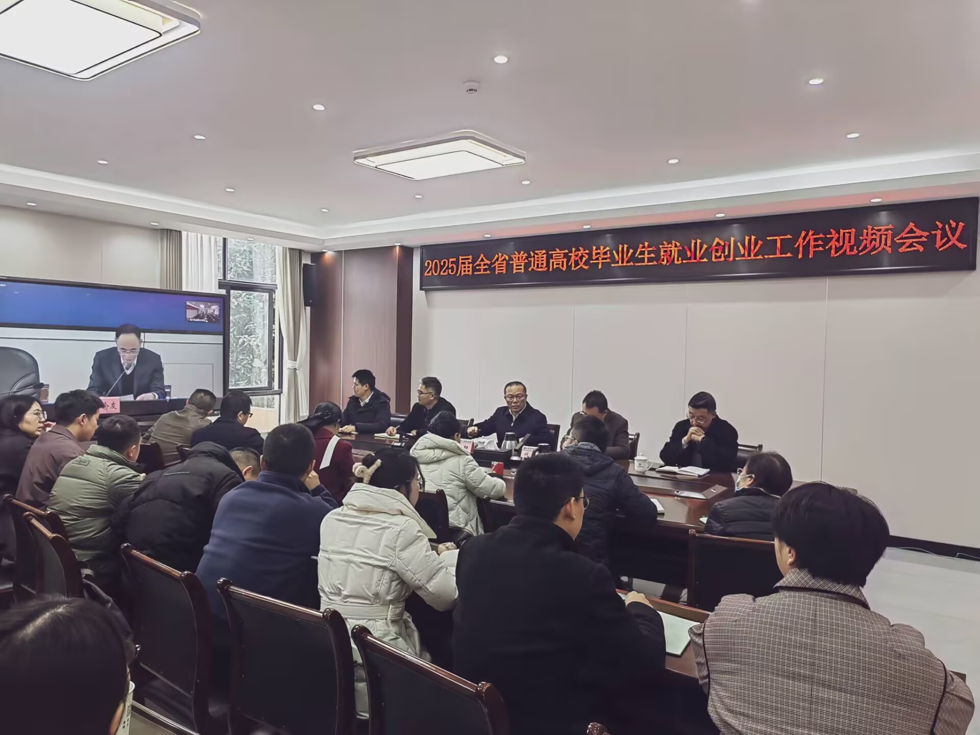 12月6日下午,教育厅、人力资源社会保障厅联合召开2025 届全省普通高校毕业生就业创业工作视频会议,深入学习贯彻党的二十届三中全会和全国、全省教育大会精神,认真落实 2025 届全国普通高校毕业生就业创业工作会议部署,全面总结 2024 届全省高校毕业生就业工作,深入分析研判当前高校毕业生就业形势,对2025届全省高校毕业生就业创业工作进行部署。威尼斯在第三会议室设分会场,党委书记贺兆轩,副校长代学灵出席,各二级学院党政负责人、毕业班全体辅导员、就业辅导员,就业处全体工作人员参加本次会议。