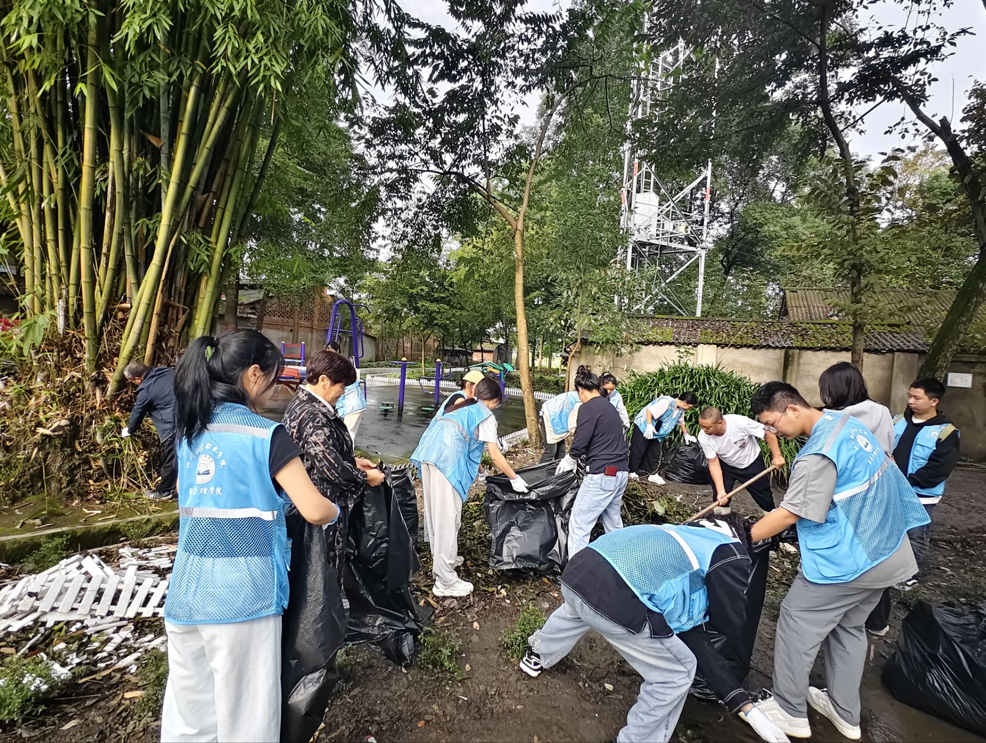 晨光初照,身着蓝色志愿服的同学们已活跃在红专村的公共区域。在环境整治一线,志愿者们手持扫帚、垃圾袋,分组清理落叶、杂物,不放过角落与器械周边的积尘。泥泞未阻热情,汗水见证付出,背景中“红专村‘焕颜行动’”横幅与跃动的蓝色身影相映成景。此次清扫不仅美化了村容村貌,也在实践中传递了环保理念,激发村民共同参与家园维护。