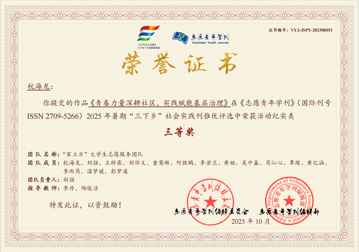 近日,经济管理学院“家立方”大学生志愿服务团队撰写的实践纪实作品《青春力量深耕社区,实践赋能基层治理》被《志愿青年学刊》(国际刊号ISSN 2709-5266)正式录用刊发。同时,在该刊物主办的2025年暑期“三下乡”社会实践刊推优评选中,该作品荣获“活动纪实类三等奖”。团队指导教师李丹、陶俊洁荣获“优秀指导教师”称号。