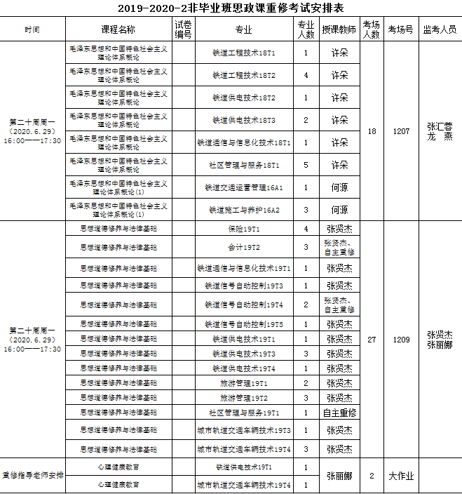2019-2020-2 非毕业班思政课重修考试安排