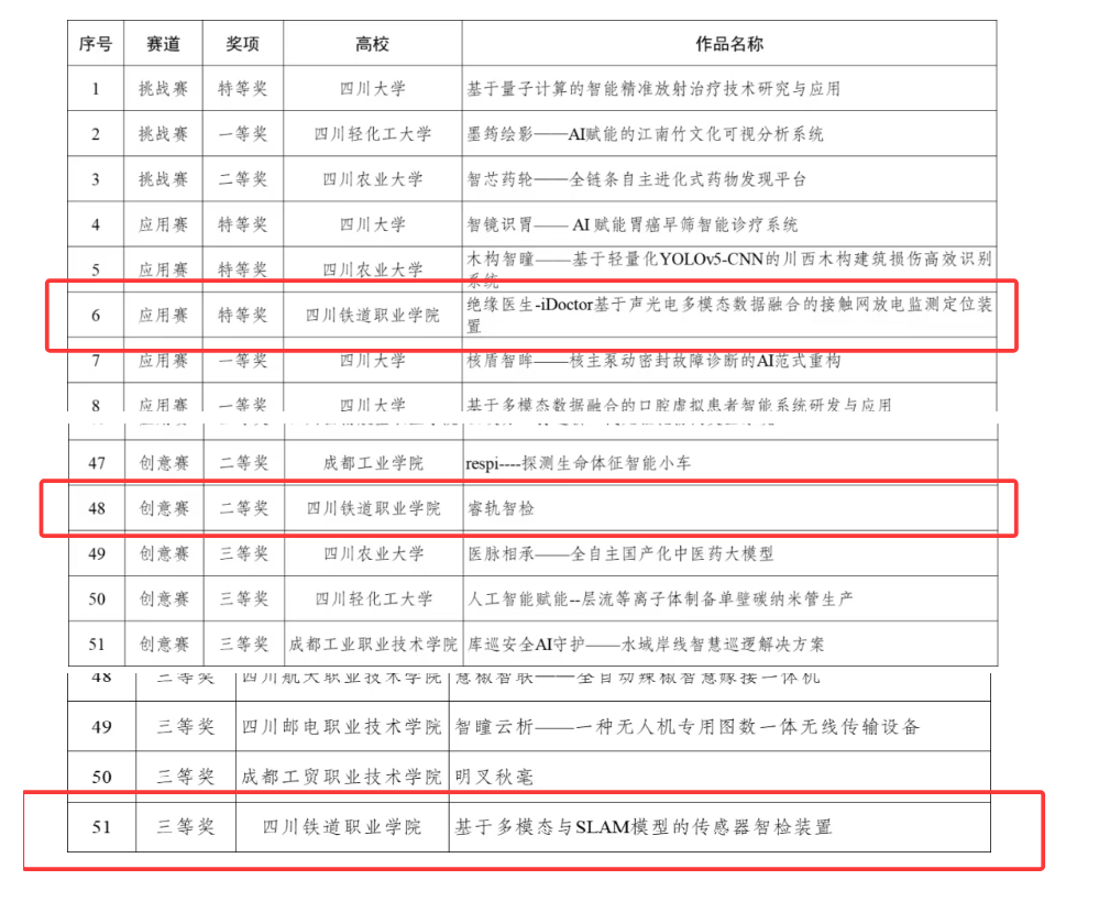 由何柏杉、刘奥老师指导,郭小龙、林浩、滕媛、唐颖颖、叶夏雨、罗杰等同学完成的作品《绝缘医生——iDoctor:基于声光电多模态数据融合的接触网放电监测定位装置》,凭借前沿的技术理念、扎实的研发成果与广阔的应用前景,荣获“人工智能+”专项赛特等奖;由李伟、哈彦梅老师指导,杨秀康、邓智杰、刘忠阳同学完成的《睿轨智检》项目荣获“人工智能+”专项赛二等奖;由罗旭、陈光杰、姚宗易老师指导,黄程、张易、陈秋月、朱俊茜、刘新宇、卢钰卓、王永琦、傅玉龙等同学完成的《基于多模态与SLAM模型的传感器智检装置》荣获主体赛三等奖。