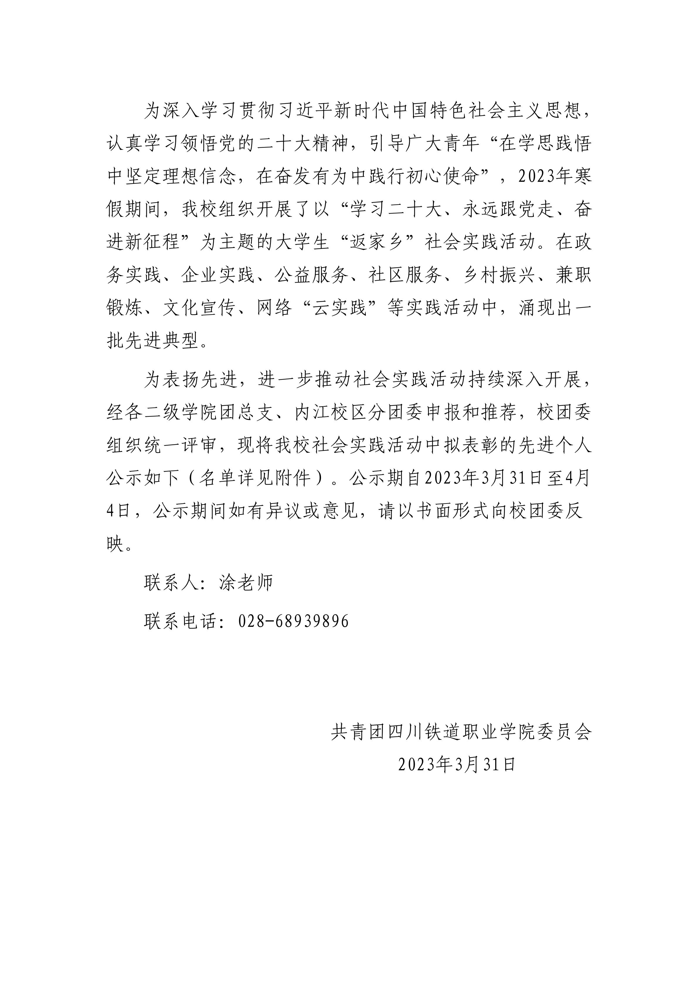 关于2023年寒假大学生“返家乡”社会实践先进个人评选结果的公示