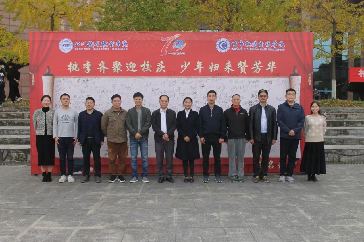 座谈会上,杨凤院长对四位校友的到来表示热烈欢迎,并从办学特色、专业群建设、产教融合、技能竞赛等方面介绍了学院的发展成就。随后,与会教师、校友、学生纷纷发言,追忆往昔,交流学习经验,畅谈人生感悟。周珩老师、庄智老师结合学校多年来的发展,从自己从教的初心,职业获得感等方面谈自己的体验感悟,充分肯定各位校友在各自领域取得的成就,表达了作为教师的欣慰、喜悦之情。各位校友也畅所欲言,分别以在母校的读书学习生活为起点,讲述了他们自己在人生发展的历程中的体会及取得的成就,感恩母校提供的平台以及各位老师的关怀、关心,同时表达了自己对母校的祝福,对师弟师妹们的殷切期待。 学校党委副书记刘昊君同志感谢各位校友百忙之中回归母校、团聚于此,追忆师生情谊,共谋学校发展。刘昊君表示,学校以优秀的校友为荣,校友们取得的优异成绩是学校的骄傲,拓展了学校的空间和维度,进一步巩固了学校的声誉;祝愿校友们进一步成长,再创事业高峰,为师弟师妹们持续做好表率;同时也希望各位校友能够继续关心、支持学校,为学校的发展和建设提供更多、更好的建议。 座谈会后,学院邀请来校校友一起参加学院举行的“桃李齐聚迎校庆 少年归来赞芳华”校友签名留言活动,校友们纷纷在签名墙签名,并在留言板上留下了对母校深深的祝福。 学校党委副书记刘昊君与返校校友、城轨学院党政负责人、教师共同合影留念。校友们纷纷表示很幸运能够在母校70周年校庆之际留下属于自己的足迹,感恩母校对自己多年的培养,祝福母校永远风华正茂,永远蓬勃向上,再创辉煌!