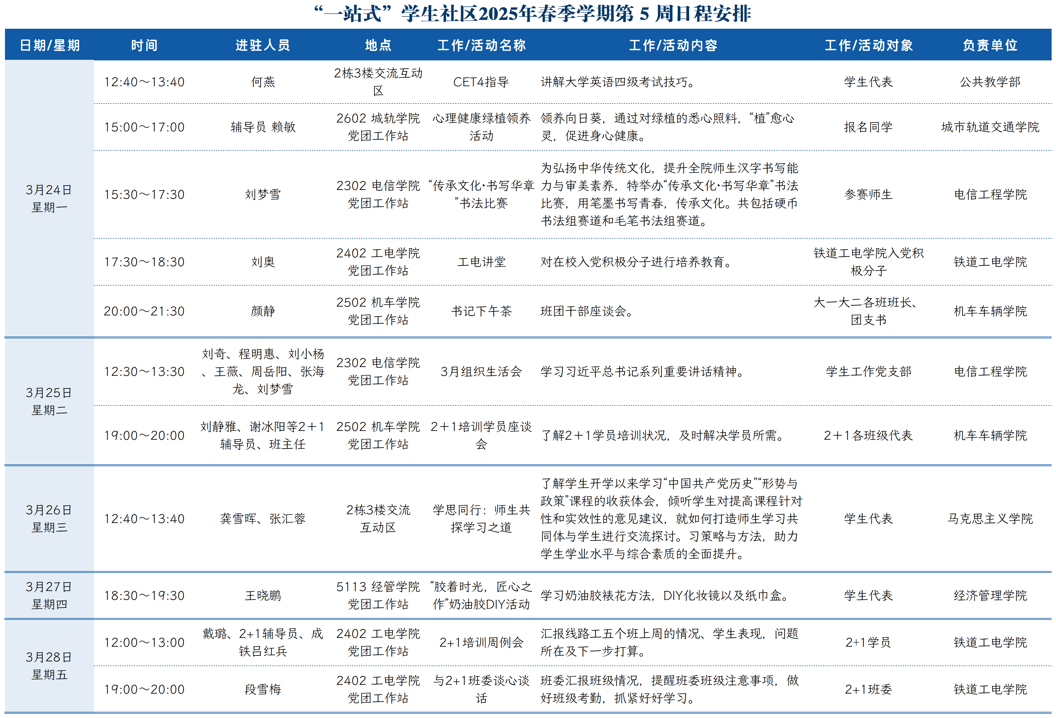 “一站式”学生社区2025年春季学期第5周日程安排
