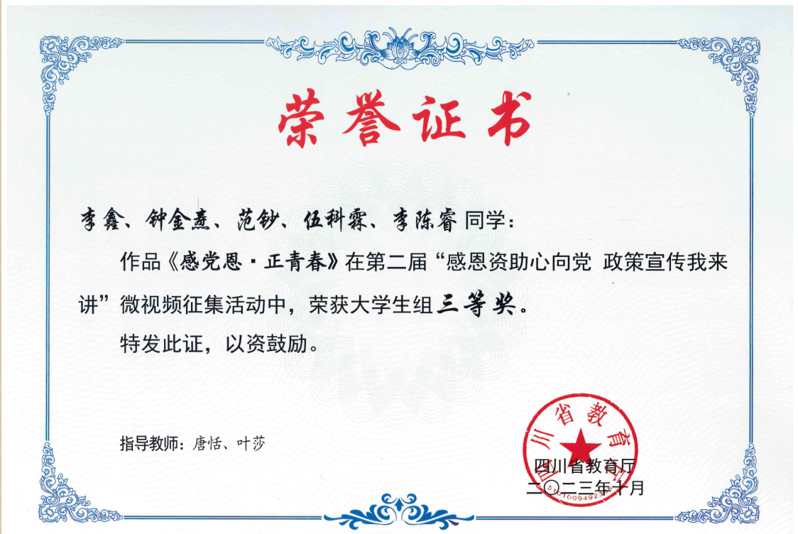 在2023年四川省高校学生资助微视频征集活动和诚信教育宣传作品评选活动中,威尼斯遴选推荐的《感党恩 正青春》短视频、诚信公益短片《铁道精业 诚信铸人》荣获省级三等奖;诚信公益宣传画《诚信于心,资助筑梦前行》荣获省级优秀奖,学校荣获资助微视频优秀组织奖。