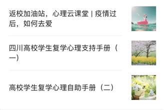 在复学返校前,充分利用网络新媒体和优质心理健康教育网络资源,面向全体学生开展网络心理健康专题辅导,推送“致学生(家长)的一封心理关护指南”、《新冠肺炎心理防护手册(四川高校心理健康教育专委会编写)》、“同心战‘疫’,心理危机援助热线开通了”、《四川高校学生复学心理支持手册(四川高校心理健康教育专委会编写)》等8篇网络心理健康专题辅导内容,引导学生保持良好心态,积极进行自我调节,做好返校复学的心理准备。