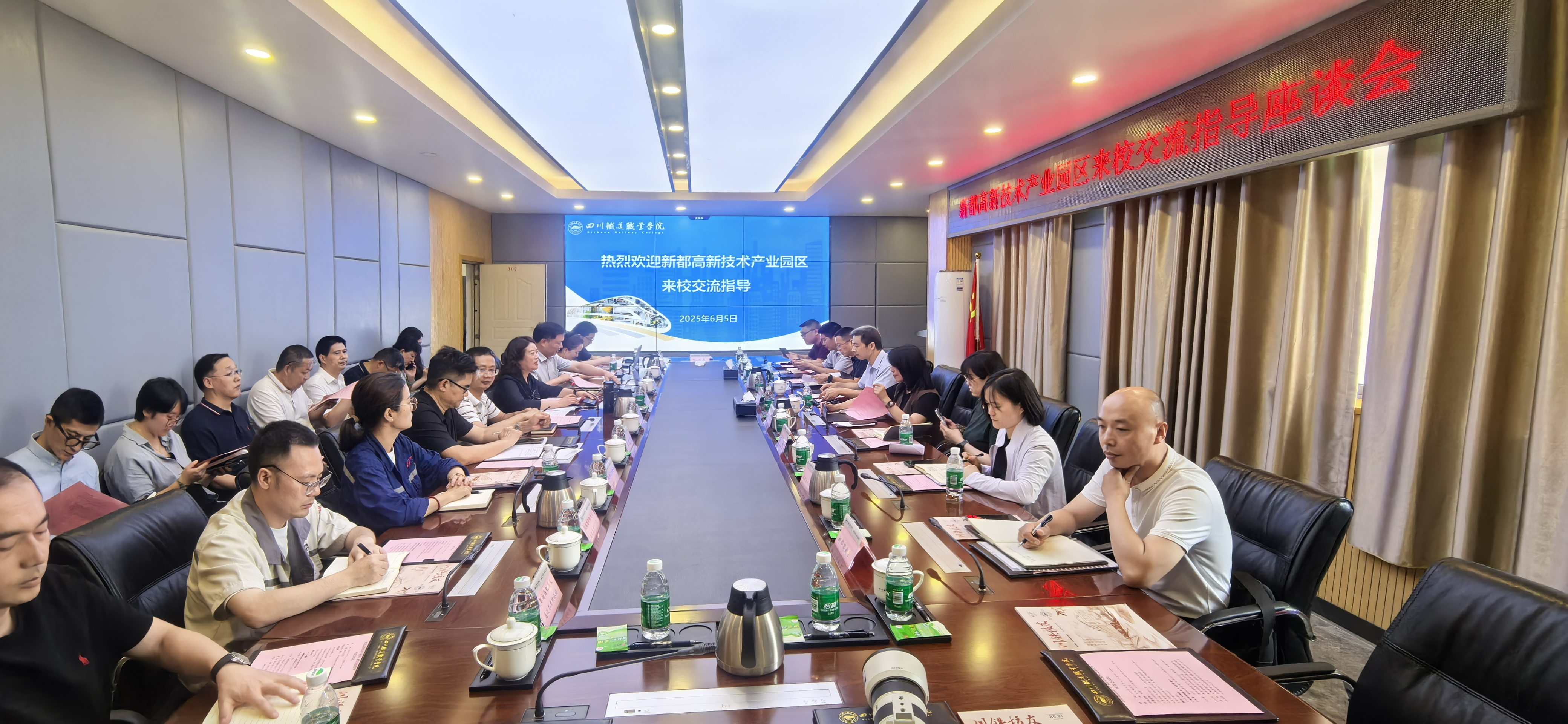 6月5日,学校与新都高新技术产业园区管委会在成都校区签订合作协议。签约仪式前,学校党委书记贺兆轩与新都高新技术产业园区党工委副书记、管委会副主任黄庚攀等领导就深化校地合作、服务协同发展进行座谈交流。学校党委副书记、校长赖芳,党委委员、副校长黄恩兴,新都高新技术产业园区党工委委员、成都市现代制造职业技术学校党委书记关小倩,新都高新技术产业园区管委会企业服务部部长徐文军等领导出席签约仪式。