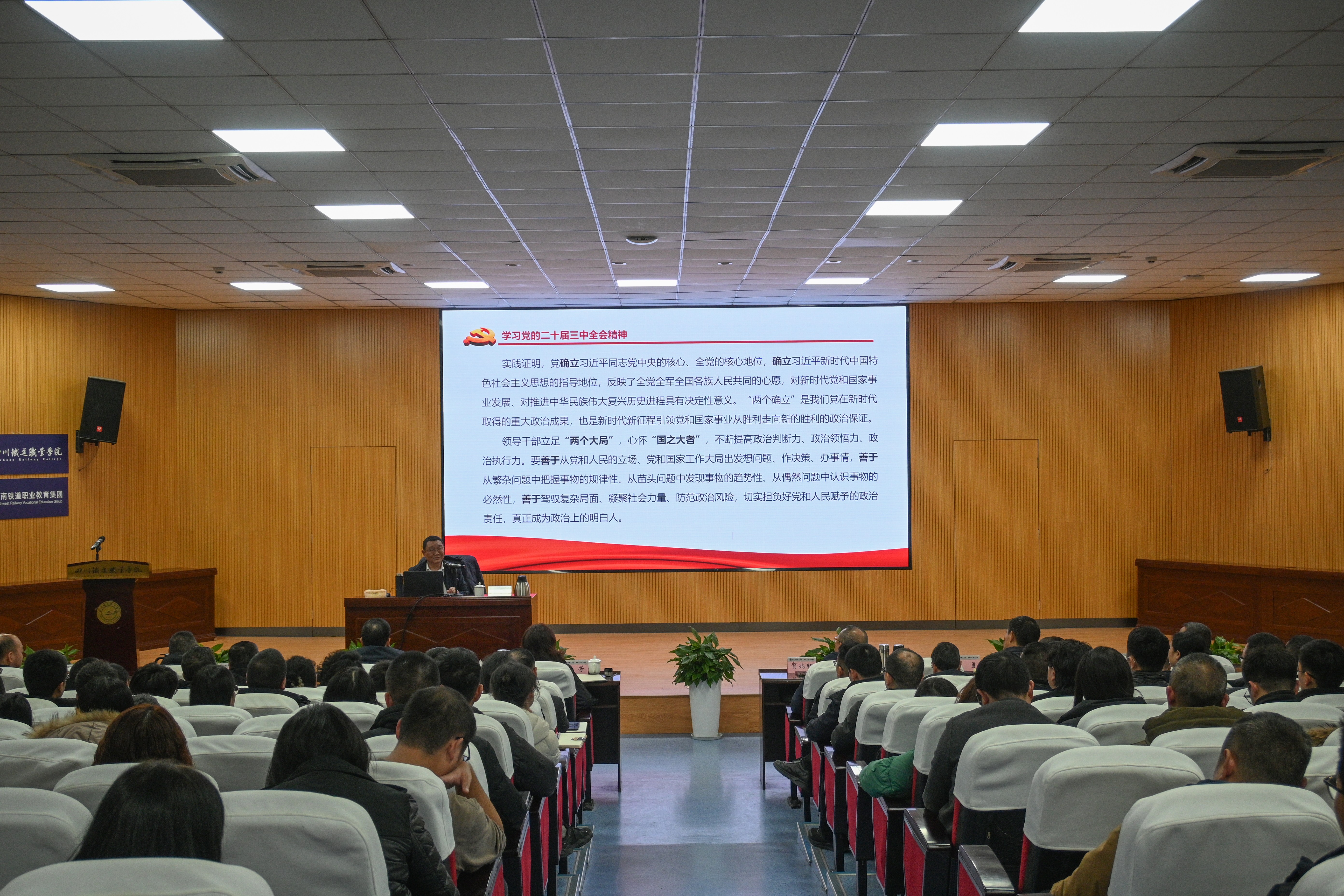 中共四川省委党校党建教研部主任王凡教授以《加强党的政治建设 切实提高政治能力》为题开展专题辅导讲座,围绕坚定政治信仰、强化政治领导、提高政治能力、净化政治生态等方面进行了全面讲解和深入解读,讲座主题鲜明、内容丰富、旁征博引,对全校干部深入认识提高政治能力的极端重要性,深刻领悟“两个确立”的决定性意义,具有很强的指导意义和促进作用。
