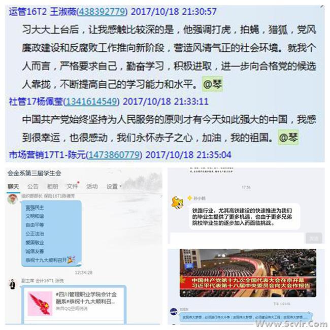 各系师生通过多种媒体渠道,积极参与大会相关话题讨论。管理系铁道运营管理14A1班的周洋同学在QQ群讨论中说到:不积跬步,无以至千里。不积小流,无以成江海。祖国能有现在的成果,都是靠一点一滴的积累。我作为中华儿女,也应该不断积累,为祖国的伟大复兴出一份力。学院及各系还充分利用官方微博、微信、QQ官方号等新媒体平台及时推送大会新闻报道,宣传大会精神。